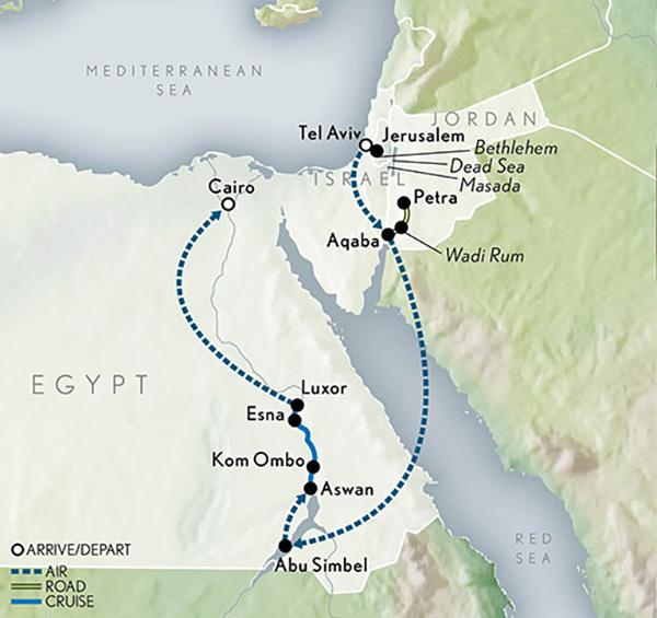 Flight Details: Tel Aviv–Aqaba (45 min) | Aqaba–Abu Simbel (1 hr 45 min) | Abu Simbel–Aswan (40 min) | Luxor–Cairo (1 hr 15 min)